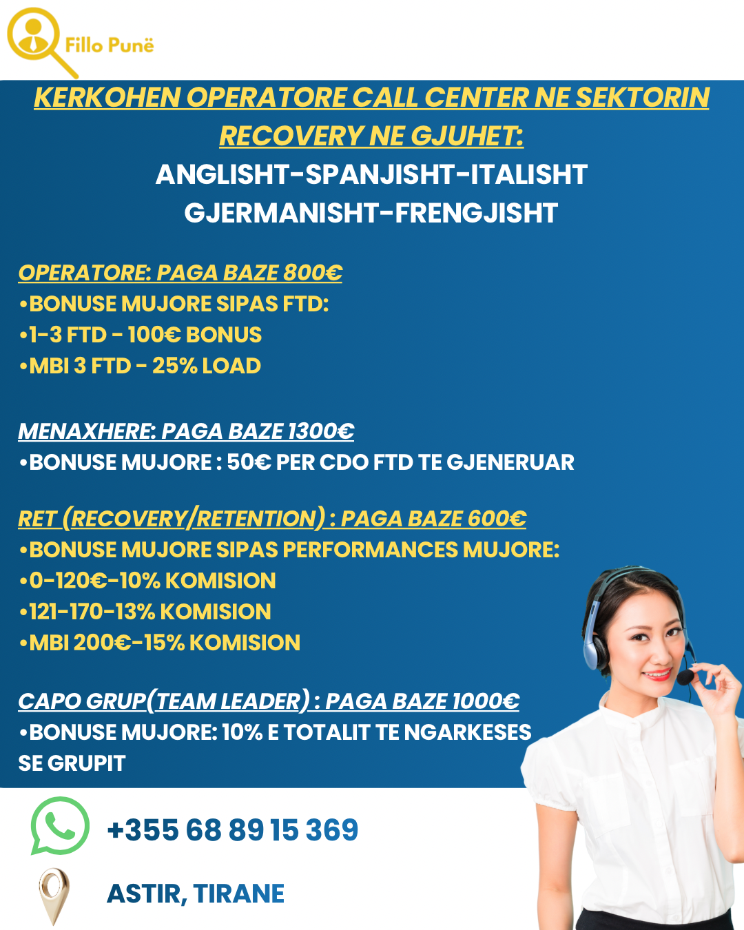 Kerkohen operatore call center ne sektorin recovery ne gjuhet: